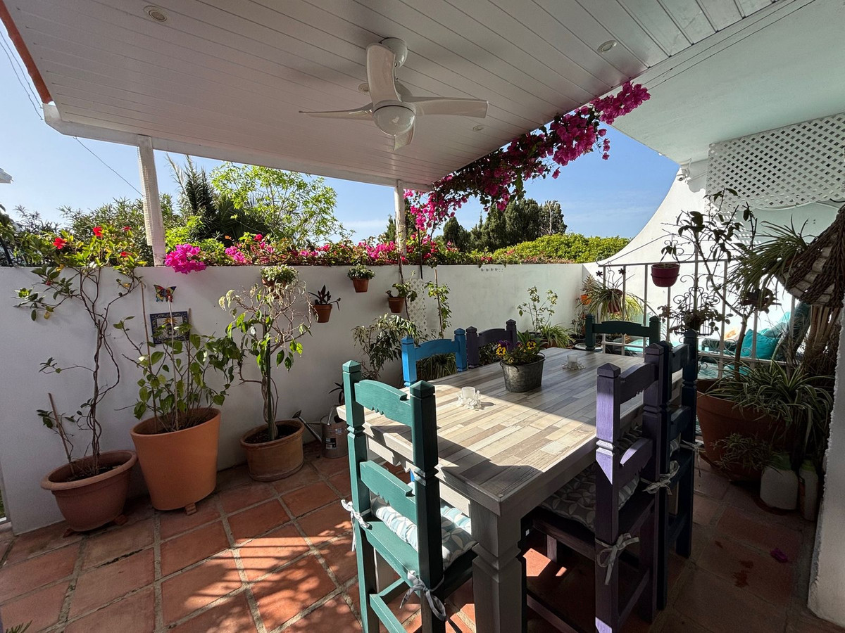 La terraza delantera, muy privada, está preparada para disfrutar del exterior, con una mesa para comer y tumbonas, además de un toldo que protege del sol en verano. Desde aquí también se puede acceder a la zona comunitaria del jardín.